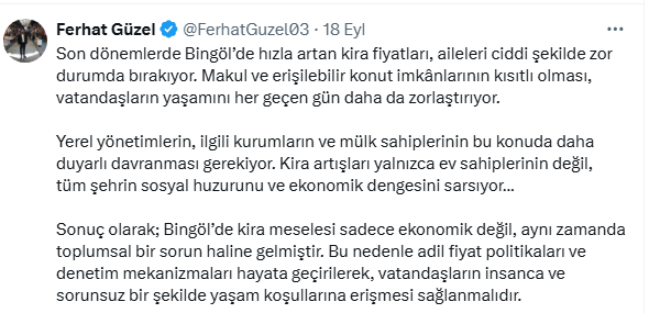 Güzel ''Bingöl’de kira meselesi sadece ekonomik değil, aynı zamanda toplumsal bir sorun haline gelmiştir. Bu nedenle adil fiyat politikaları ve denetim mekanizmaları hayata geçirilerek, vatandaşların insanca ve sorunsuz bir şekilde yaşam koşullarına erişmesi sağlanmalıdır.'' diyerek yetkililere seslendi. İşte Ferhat Güzel'in sosyal medya hesabı X'ten yaptığı o paylaşım...