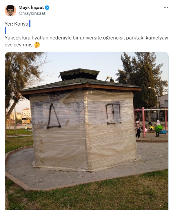 Akademisyen İnşaat Mühendisi Mayk İnşaat, sosyal medya hesabından Konya'da bir öğrencinin yüksek kiralardan dolayı parktaki kamelyayı, eve dönüştürdüğü açıkladı.