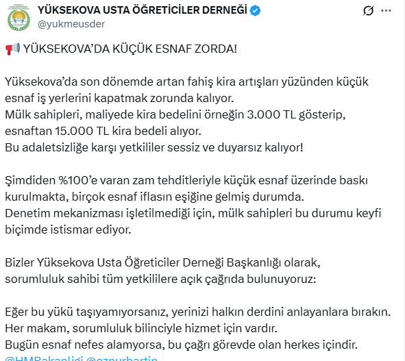 Yetkililere seslenen dernek, küçük esnafın içinde bulunduğu kira sorununa çözüm bekliyor. İşte Yüksekova Usta Öğreticiler Derneği'nin sosyal medya hesabı X'teki o paylaşımı;