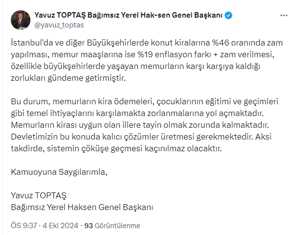 Toptaş, sosyal medya hesabı X'ten yaptığı paylaşımda, yüksek kira bedellerinden dolayı memurların daha uygun kiraların olduğu illere tayinlerini istedikleri belirtti. İşte Toptaş'ın o paylaşımı...