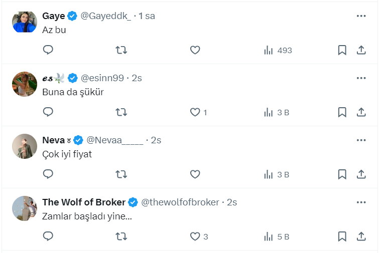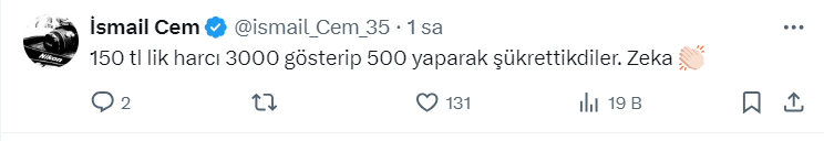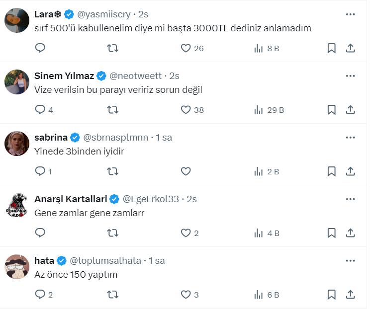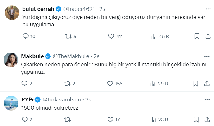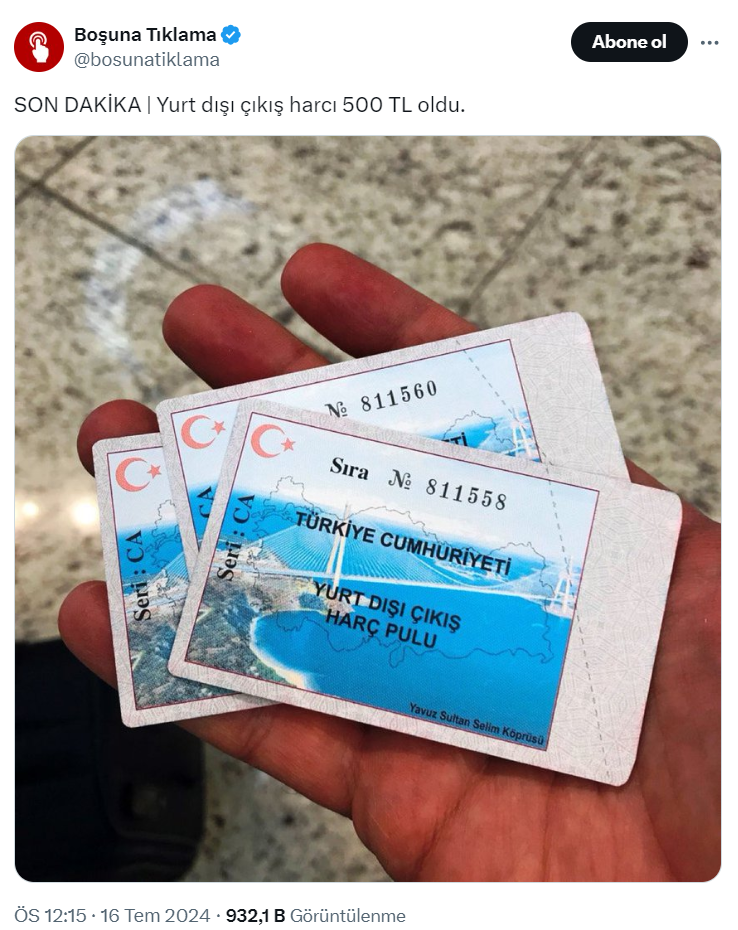 1 milyon takipçili Boşuna Tıklama, X hesabı https://x.com/bosunatiklama üzerinden Yurt dışı çıkış harcına geçen zammı paylaşırken vatandaşlardan da pek çok yorum geldi. Gelen yorumlar arasında, "1.500 olmadı şükredeceğiz", "Yine de 3 binden iyidir. " yorumları dikkat çekti.