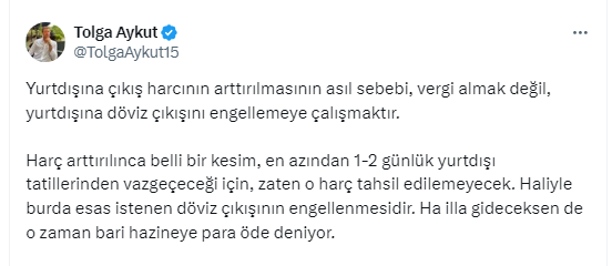 Gündemde yurt dışı harçlarla ilgili bu gelişmeler yaşanıdken yatırım uzmanı, ekonomist Tolga Aykut https://x.com/TolgaAykut15 X sosyal medya hesabından yaptığı paylaşımda, harcın artırılma nedenine farklı bir açıklama getirdi. Aykut’un bu açıklamasına vatandaştan tepki gecikmedi.