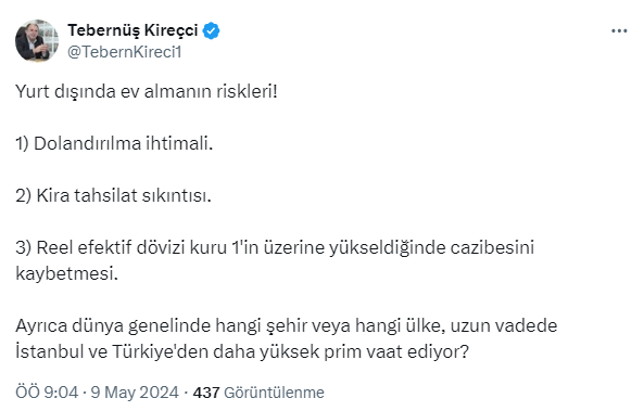 Konut fiyatları fahiş rakamlara ulaştı. Konut fiyatlarındai yükseliş, konut kredisine erişimin azalması vatandaşın konut sahibi olmaısna engel oluyor. Hal böyle olunca vatandaşlar yurt dışından konut almaya başladı. Peki yurt dışından konut almak mantıklı mı? Yurt dışından konut almanın riskleri neler? Türkiye'nin 1 numaralı emlak ve konut editörü Tebernüş Kireçci yurt dışında ev almanın risklerini 3 maddede açıkladı. İşte o paylaşım ve gelen yorumlar...