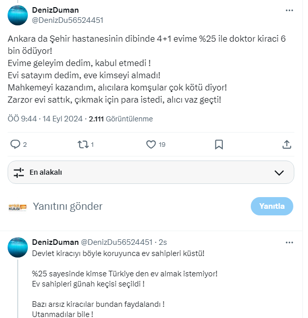 Duman, bu uygulama ile ev sahiplerinin küstüğünü ve artık kimsenin ev almak istemediğinin altını çizdi. Suç keçisi olarak ev sahiplerini gören sistemi eleştirerek, devletin ev sahiplerinin yanında olmadığını belirtti. İşte Mağdur ev sahibi Deniz Duman'ın sosyal medya X'ten yaptığı o paylaşım...