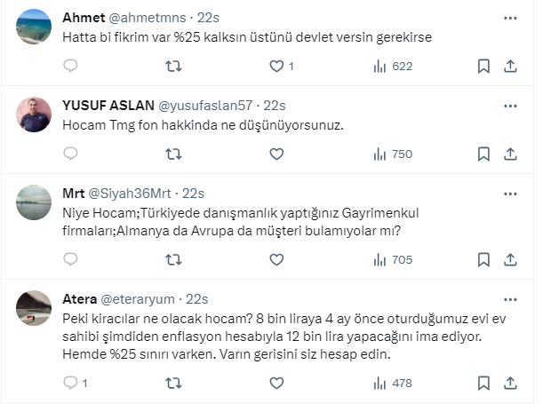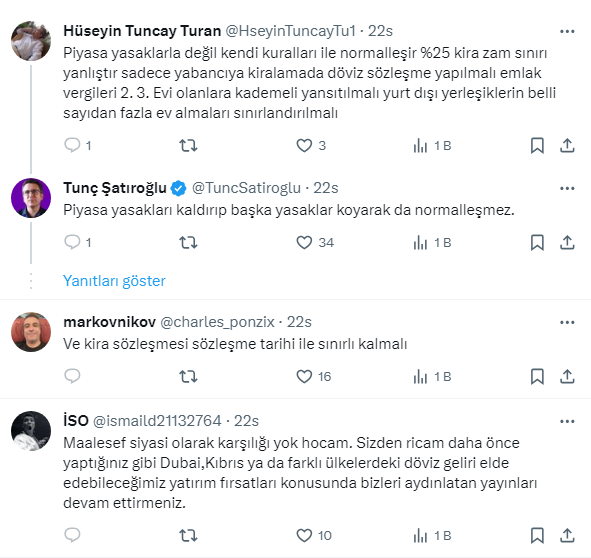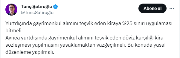 Emlak piyasasındaki durgunluğa çözüm olarak Ekonomist Tunç Şatıroğlu, X sosyal medya hesabı https://twitter.com/TuncSatiroglu üzerinden yaptığı paylaşımda yurt dışındaki alımları teşvik eden kiraya yüzde 25 uygulamasının kaldırılmasını ve dövizle kiralamaya getirilen yasaktan vazgeçilmesi gerektiğini ifade etti.