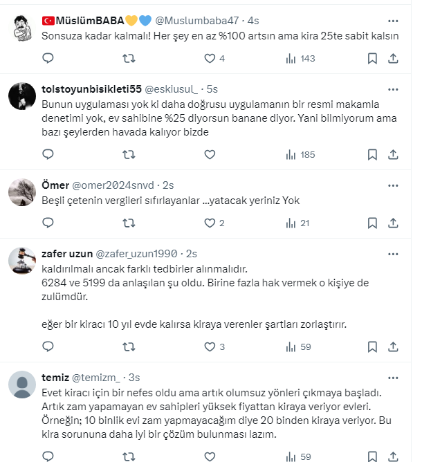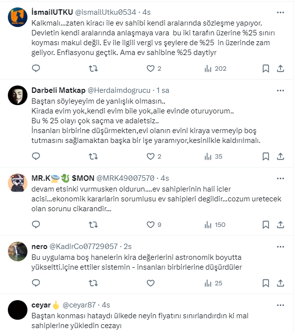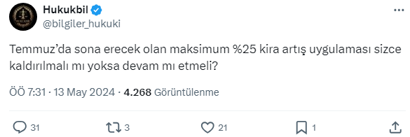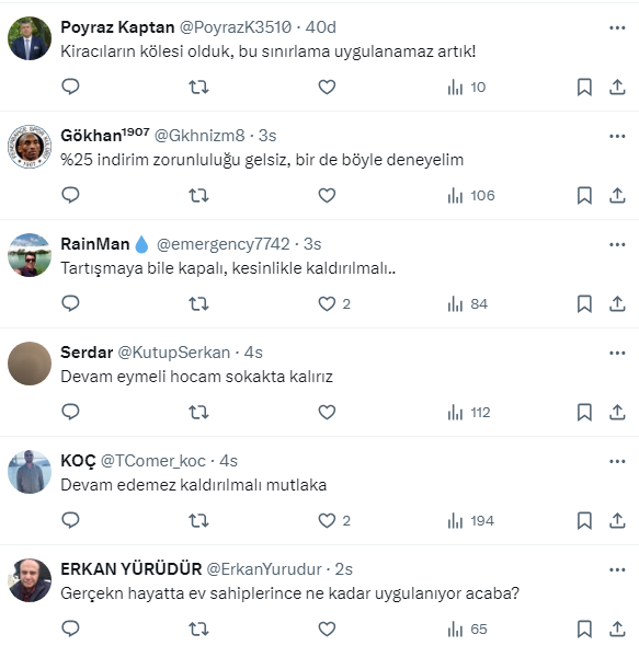 Kiracı ve ev sahipleri arasında yaşanan gerilim her geçen gün artıyor. Kiraların fahiş rakamlara ulaşması ile ev sahibi ile kiracı arasındaki kavgalar her geçem gün büyüyor. Kira bedellerinde fahiş artışların önüne geçilmesi için uygulamaya alınan yüzde 25 kira sınırı ev sahiplerini zor durumda bıraktı. Her gün gündemde olan yüzde 25 kira artışın uygulamasının Temmuzda kaldırılması planlanıyor. Hukukbilgileri adlı sosyal medya X kullanıcısı konuyla ilgili paylaşım yaptı ve vatandaşlara '' Yüzde 25 artış uygulaması kaldırılmalı mı, devam etmeli mi?'' sorusunu sordu. Bakın vatandaş ne cevap verdi. İşte o paylaşım ve gelen yorumlar...