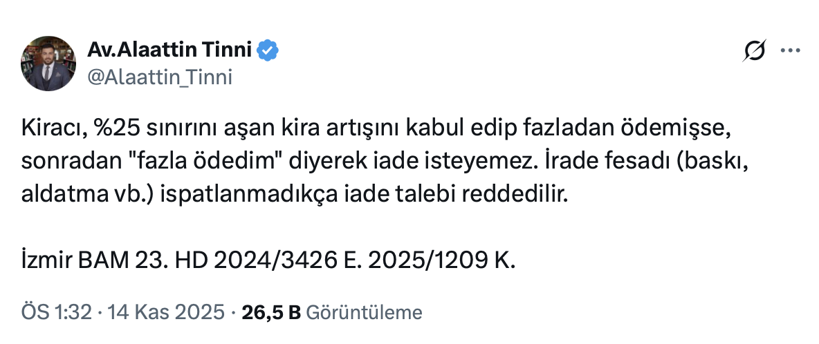 Avukat Alaattin Tinni resmi sosyal medya hesabı https://x.com/Alaattin_Tinni üzerinden yaptığı paylaşımda kiracı, yüzde 25 sınırını aşan kira artışını kabul edip fazladan ödemişse, sonradan "fazla ödedim" diyerek iade isteyemeyeceğini belirtti.