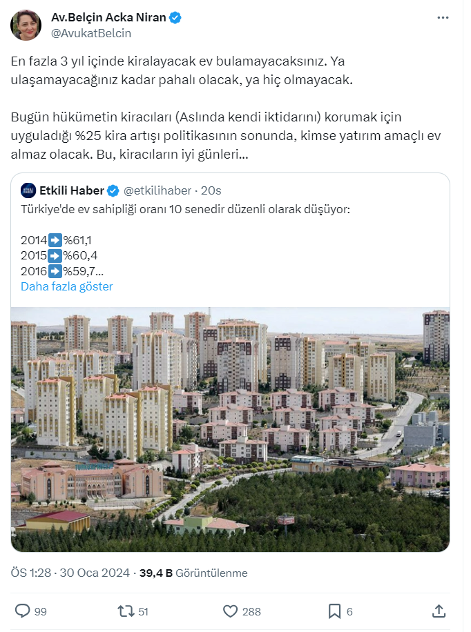 Belçin Acka Niran paylaşımının devamında şu ifadeleri de kullandı: "Bugün hükümetin kiracıları (Aslında kendi iktidarını) korumak için uyguladığı yüzde 25 kira artışı politikasının sonunda, kimse yatırım amaçlı ev almaz olacak. Bu, kiracıların iyi günleri..."