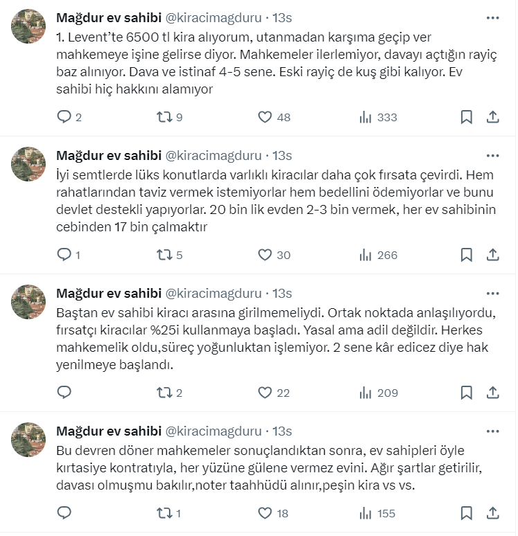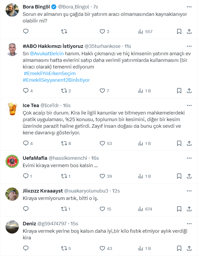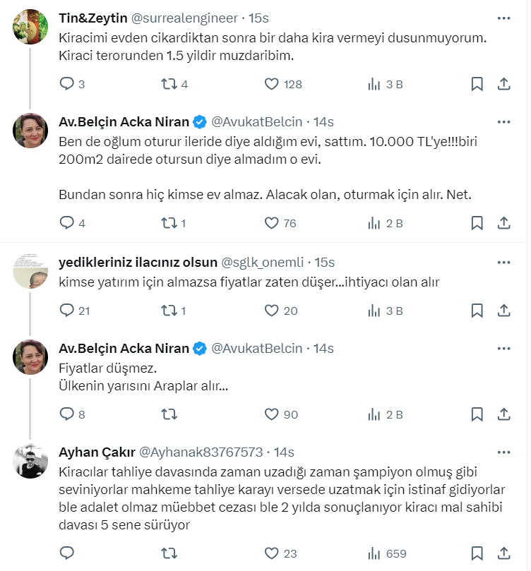 Resmi X hesabı https://twitter.com/AvukatBelcin üzerinden konu ile ilgili bir paylaşım yapan Avukat Belçin Acka Niran en fazla 3 yıl içinde kiralayacak ev bulunamayacağını ya ulaşılamayacak kadar pahalı olacağını ya da hiç olmayacağını söyledi.