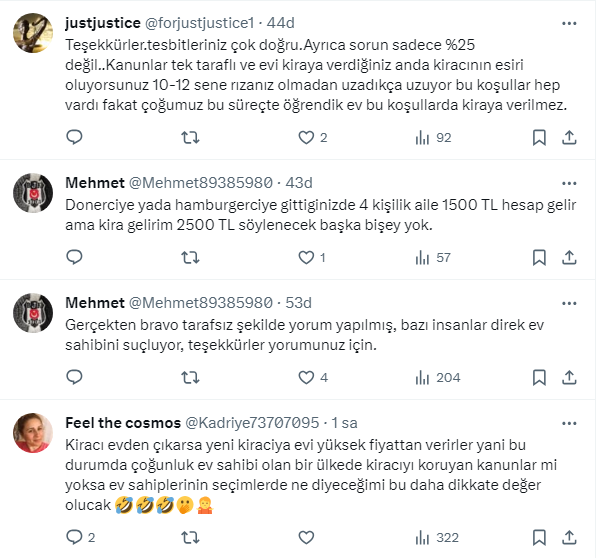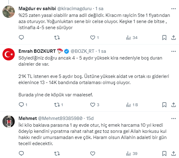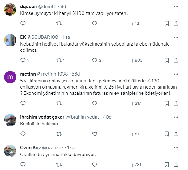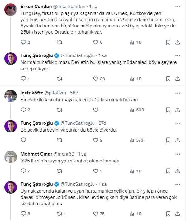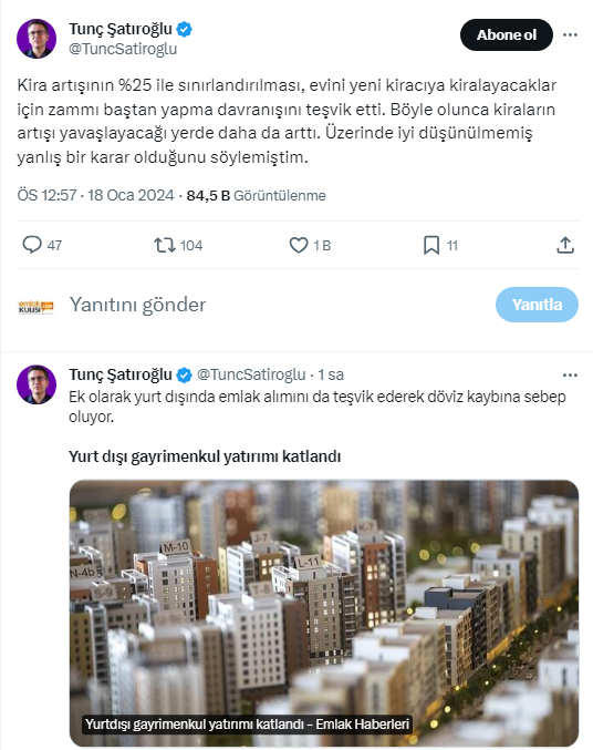 Ev sahibi kiracı kavgaları hız kesmeden devam ederken, Ekonomist Tunç Şatıroğlu, X sosyal medya hesabından yaptığı paylaşımda "kira artışının yüzde 25 ile sınırlandırılmasıyla kiraların artışı yavaşlayacağı yerde daha da arttı." ifadelerini kullandı.