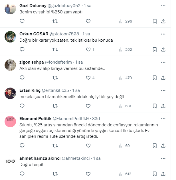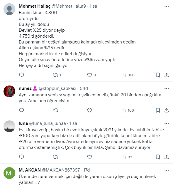 Ev sahibi kiracı kavgaları hız kesmeden devam ederken, Ekonomist Tunç Şatıroğlu, X sosyal medya hesabı https://twitter.com/TuncSatiroglu üzerinden yaptığı paylaşımda "kira artışının yüzde 25 ile sınırlandırılmasıyla kiraların artışı yavaşlayacağı yerde daha da arttı." ifadelerini kullandı.