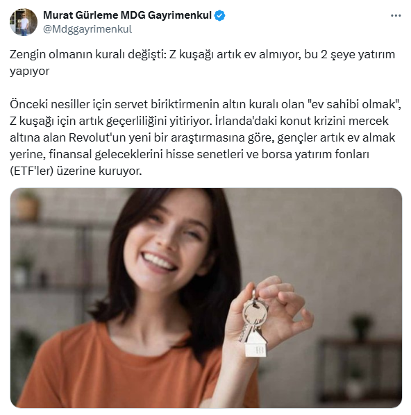Önceki nesiller için servet biriktirmenin altın kuralı olan "ev sahibi olmak" gençler tarafından tercih edilmiyor. Gayrimenkul uzmanı Murat Gürleme, sosyal medya hesabından konut yatırımı yapanların çocunlukla orta veya yaşlıların ilgisini çektiğini söyledi.