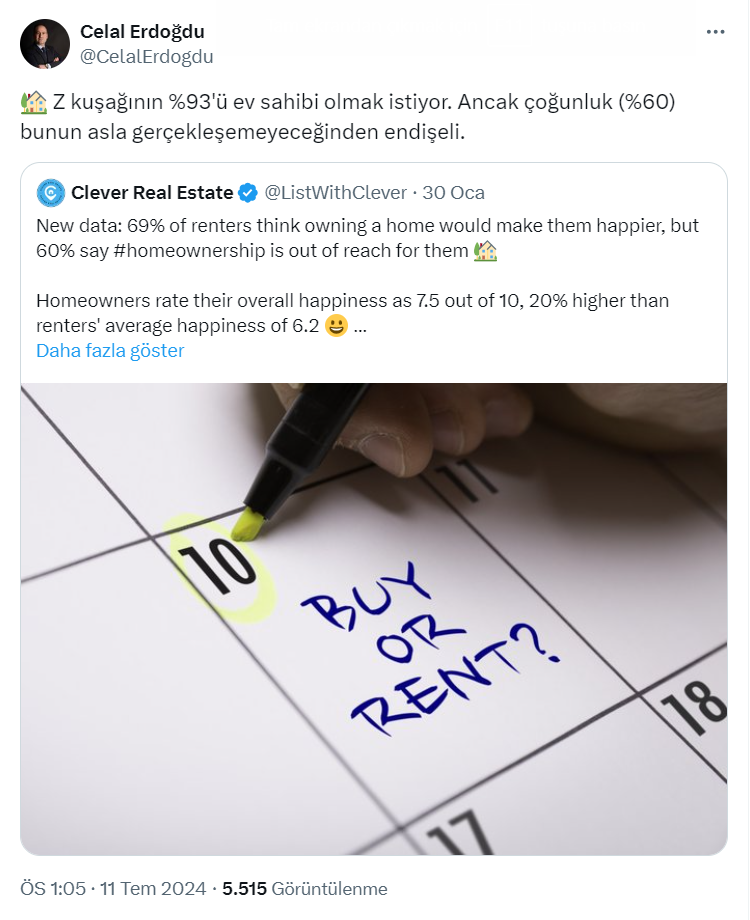 Celal Erdoğdu, yaptığı paylaşımda Z kuşağının yüzde 93'ü ev sahibi olmak istediğini belirterek, ancak yüzde 60'ının bunun asla gerçekleşemeyeceğinden endişeli olduğunu söyledi.
