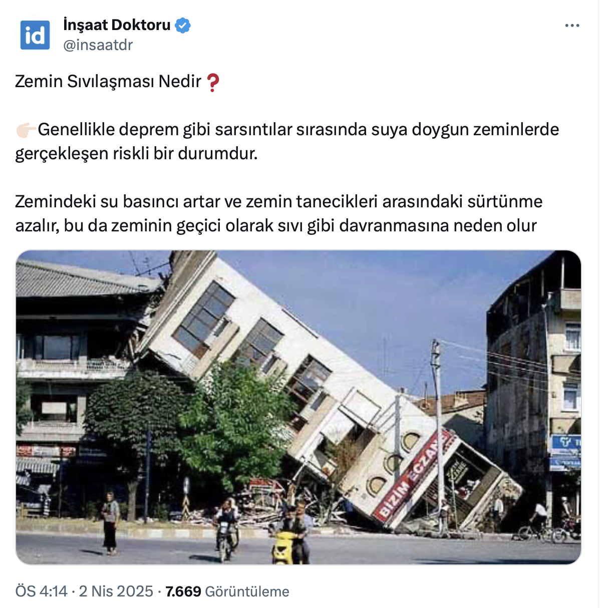 Pek çok kişi zemin sıvılaşması ile ilgili araştırmalar yaparken konu ile ilgili paylaşım 41,6 bin takipçili İnşaat Doktoru'ndan geldi.