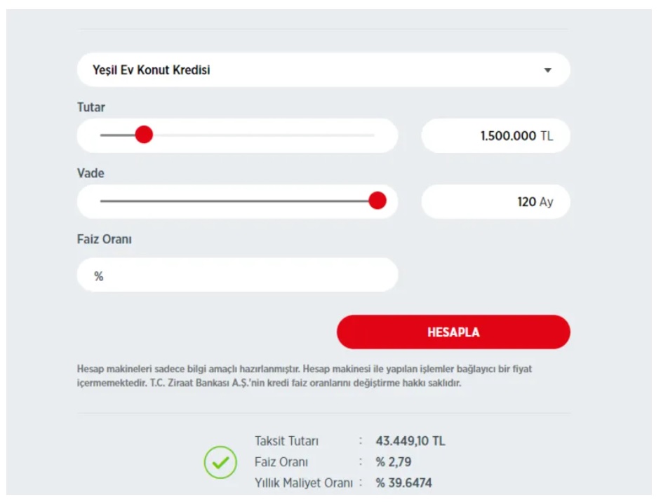 Kampanya kapsamında sunulan kredi için aylık faiz oranı yüzde 2,79 olarak belirlenmiş durumda. 1,5 milyon TL tutarındaki kredi için 120 ay vadeli ödeme planı ile aylık taksit tutarı 43.449,10 TL oluyor. Yıllık maliyet oranı ise yüzde 39,6474 olarak hesaplanıyor. Bu oranlar bilgi amaçlı olup, Ziraat Bankası faiz oranlarında değişiklik yapma hakkını saklı tutmaktadır.